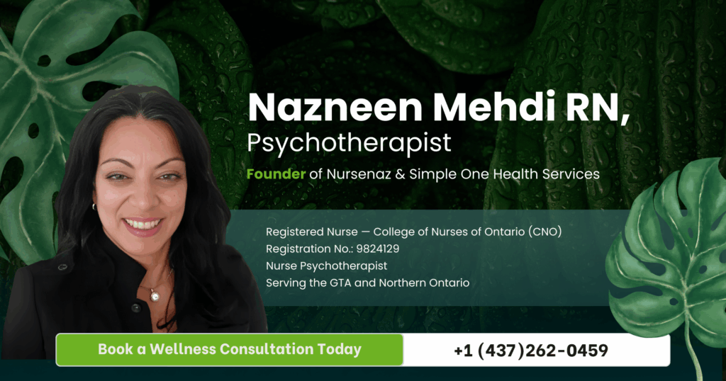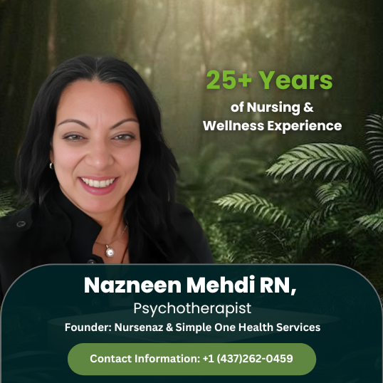 Welcome to NurseNaz.ca, your trusted partner in holistic health care. Led by Nazneen Mehdi — a Registered Nurse and Nurse Psychotherapist — we provide personalized, professional services that combine physical health education with mental health support. Whether you’re in the Greater Toronto Area or Northern Ontario, we bring care to your doorstep or device — in-person and virtually.
